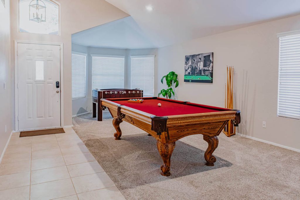 The living room welcomes you to unwind, while the pool table area provides a more active way to pass the time.